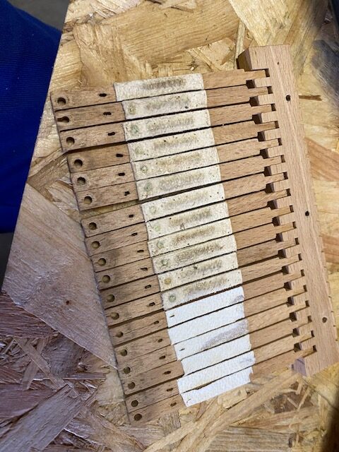 Le sommier bien encastré a été libéré et emmené en atelier. Délicatement touts les vis ,ressorts, guides, poussoirs, et soupapes minuscules ont été démontés. Le sommier a été vérifié, des parties décollées recollées et un léger dressage du siège de soupapes a été fait. Les guides, ressorts et vis ont été dérouillés et enduit de cire microcristalline pour préservation. Les peaux des soupapes ont toutes été remplacées et les soupapes dressées.